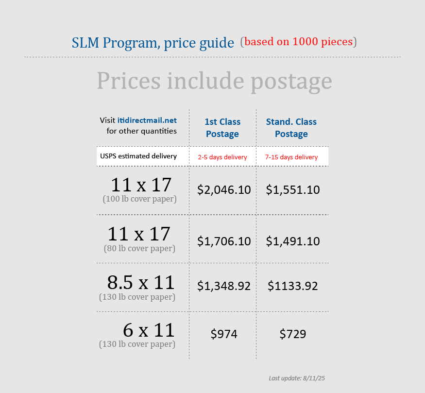Click here if you are interested in mailing this same product using EDDM postage (Every Door Direct Mail). Below is a comparison table between EDDM and this product.